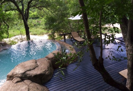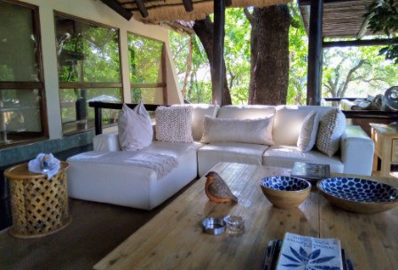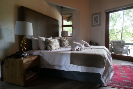L’aeroporto di Hoedspruit è piccolo, i bagagli li scaricano dalla stiva e ce li porgono direttamente, i 4 o 5 banchi del check in sono in legno scuro. Una macchina ci attende e nel giro di un’ora attraversiamo il cancello oltre il quale è la proprietà del Kuname Lodge, un hotel diffuso, se così si può dire, con grandi ambienti comuni dotati di piscina e alcuni chalet: tutti su un avamposto roccioso che domina il letto di un fiume in questo momento completamente secco. Veniamo a sapere che questa parte del Sud Africa sta vivendo da tempo una grave siccità. Avevamo immaginato una bella struttura alberghiera, ma questa supera le nostre aspettative: è raffinatissima. All’esterno ogni albero, cespuglio, pietra è stato disposto secondo un certo disegno. All’interno la comodità non fa a meno di decorazioni africane. Al Kuname, che probabilmente arriva a ospitare una decina di persone, Valeria ed io siamo quasi sempre sole. Nel nostro chalet ci attendono letti cosparsi di petali di rosa e asciugamani piegati a forma di facocero. Due cugine in viaggio di nozze!? Ce la ridiamo alla grande, ma in fondo non ci dispiace. Ci frequentiamo da quasi quarant’anni, ma non abbiamo trascorso assieme mai più di due o tre giorni! Ogni sera troveremo nella nostra stanza cioccolatini e biglietti con pensieri augurali.