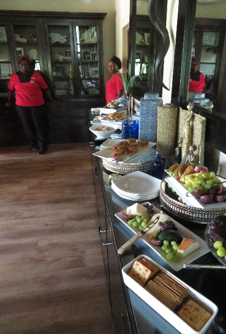 Tralascio le meraviglie del cibo e del modo in cui ci viene offerto. Personalmente mi innamoro dell’eleganza della disposizione del cibo: è vero che questo non depone senz’altro a favore della qualità di ciò che viene servito, ma davanti a tavoli allestiti in modo così elegante e a piatti che sembrano quadri astratti, quasi quasi mi dispiace scomporre il tutto per dedicarmi alla banale attività del nutrirmi. Il Kuname vive ancora di modalità di rapporto cogli ospiti che mi sembrano improntate all’antico colonialismo inglese. Al ritorno dai nostri safari giornalieri saremo accolte dal responsabile dell’hotel e da un paio di camerieri in giacca rossa che ci porgono piccoli asciugamani umidi e caldi con cui detergerci le mani…impolverate! Ormai viviamo di maniere rudi e sbrigative, le usiamo spesso anche noi, ma tornare alla lentezza, al rispetto reciproco, che è fatto anche di sguardi, di attese, di mani tese è confortante. Le donne corpulente che lavorano in cucina e che ci guardano mentre ritiriamo i cibi dal buffet sono nere, e indossano abiti lunghi di un rosso violento. Sorridono, e il loro sorriso è il più dolce della terra. Ho la sensazione che le nere abbiano tutto della madre archetipica, morbidezza, accoglienza, tenerezza, ed un corpo da cui, ad abbracciarle (lo faremo prima di andar via), ci si sente circondati come quando si entra in un mare calmo, chiaro, tiepido.