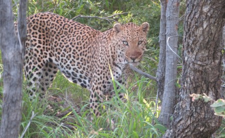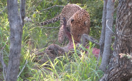 Un leopardo si sofferma a guardarci con diffidenza, ha appena ucciso una preda, e forse si chiede se deve affrontare un rivale proprio nel momento più ambito, quello del pasto. Rassicurato, si nasconde nei cespugli, intravediamo e udiamo con orrore lo strappo di pezzi di carne dalle ossa del facocero ucciso.