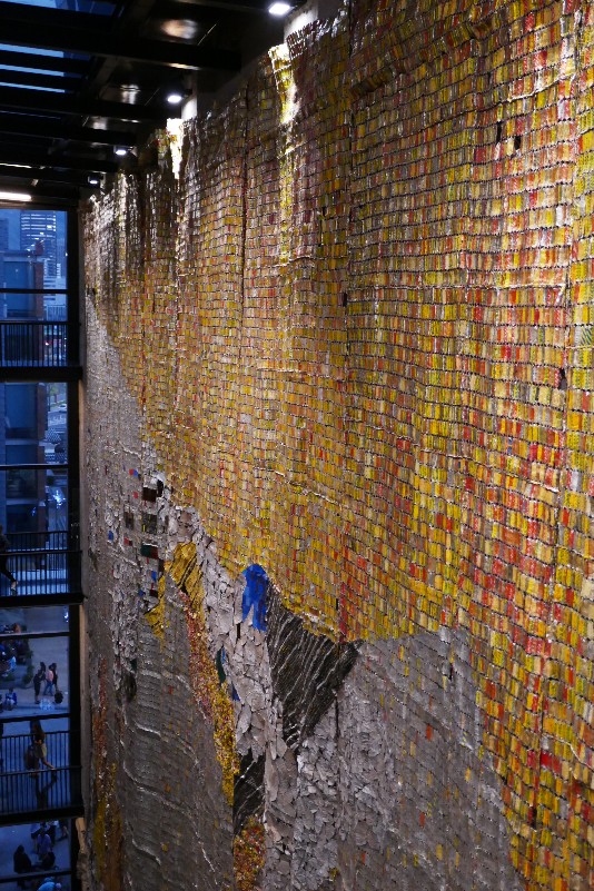 storia, e non solo quella del SudAfrica, ma quella di tutti noi. Di per sé lo Zeitz MOCAA è anche un edificio assai intrigante: nella corte interna era visibile un arazzo di El Anatsui: composto da una sorta di scaglie di vario formato che formavano grandi campiture di colore, e appeso proprio sotto il tetto, scendeva giù a terra per ben quattro piani. La mia sensazione di fronte a tutto ciò è stato di stare penetrando un po’ nel cuore di questo paese a me ignoto, e mi sono sentita intimidita e sgomenta, nell’ansia di non capire tutto ciò che aveva nutrito opere assai diverse da quelle che a noi sono familiari dalla infanzia: qui colori violenti, materiali (paglie, plastiche) che ti chiedono di toccarli (e non puoi), tutti segnali per me di una cultura attraente ma davvero misteriosa. Dico subito che il resto del viaggio (due abbondanti settimane) non avrebbe dato risposte esaurienti a tanti degli interrogativi che mi sembravano aleggiare allo Zeitz: come si sono integrate, se lo hanno fatto, la cultura di questo con le tante culture del continente africano, e che è accaduto rispetto alle culture dell’Europa, o agli Stati Uniti? Colonialismo e postcolonialismo pongono questioni così complesse che mi sono sentita impotente e priva di strumenti adeguati rispetto alla realtà sudafricana. Insomma, una “turista”, con tutto ciò che nel bene e nel male, nella innocente curiosità e alla non meno innocente ignoranza a questo può accompagnarsi. Straordinariamente proprio allo Zeitz abbiamo incontrato una scompaginata, Marta, con Giulia, Bea, Paolo e Giovanni, un’allegra brigata con cui abbiamo condiviso una cenetta in un ristorante dalle pareti coloratissime.