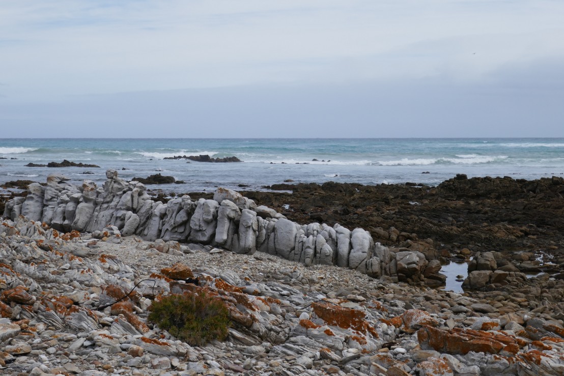 Cape Agulhas si staglia su un paesaggio piatto, radi insediamenti abitativi che ricordano quelli norvegesi, casette bianche a uno o due piani dai tetti scuri molto spioventi, prati ben tosati all’inglese. Le spiagge (si può chiamarle così?) sono disseminate di rocce grumose, piccoli massi a tratti allineati uno accanto all’altro come tanti totem che si fanno compagnia. Il vento è violento, quasi freddo. Pioviccica. Girano poche persone. Il luogo, così desolato, ha un suo fascino, ma non si può certo definire ospitale. NEXT
