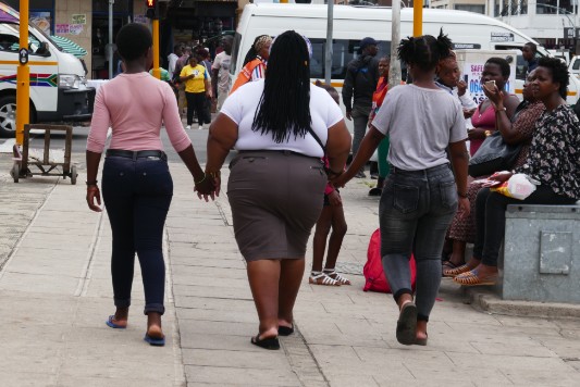 O meglio le etnie qui sono tante, e sono diversi i corpi che ci sfilano davanti (Durban sembra essere, almeno in questo momento, una località di villeggiatura) e che incontriamo nell’enorme e affollato ristorante dell’albergo, dove Valeria ed io siamo le uniche rappresentanti dell’etnia bianca. In compenso qui i neri non ci guardano con ostilità, come a Capetown, ma con una qualche simpatia. Uomini e donne bassi e grassi, che portano con indifferenza e con una certa fierezza pance e deretani considerevoli, ammantati in tessuti dalle vivaci cromie, ed altri invece alti e segaligni, abbigliati in abiti dalla foggia severa: e poi tutte le vie di mezzo rispetto a questi estremi. Non mancano gli indiani. E carnagioni nero cioccolato, nero fumo, nero marroncino, crema. Qualche donna molto bella. Tutti sorridono e sembrano estremamente a loro agio. Pare che Durban sia una città pericolosa, ma nelle poche ore della nostra sosta Valeria non si lascia certo intimorire e fa una passeggiatina nei dintorni.