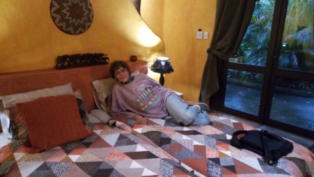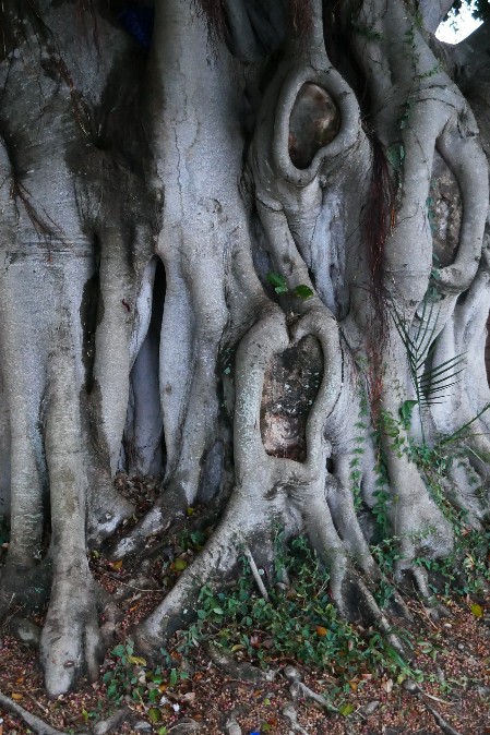 Nel verde si intravedevano un paio di villette, mentre salendo una scala di legno, ci aspettava la casa padronale, arredata in stile africano, come le nostre stanze, e la piscina. Simpatici i padroni di casa, una coppia il cui inglese, certo un dialetto del luogo, lì per lì ci ha dato filo da torcere. Le vocali che si pronunciano chiuse loro le pronunciavano aperte, e a volte aggiungevano vocali che nelle parole inglesi non ci sono (il loro sáif, per dire “sicuro” – safe- è indimenticabile). Aveva appena smesso di piovere e le grandi foglie degli alberi gocciolavano e scintillavano alla luce del tardo pomeriggio. Già in Kenya, tanti anni fa, avevo fatto esperienza di questa natura prepotente, di alberi così poderosi che sembra quasi di sentir fremere dentro i tronchi una vita potente e inesauribile. Le radici si intrecciano, si dispongono a mazzi, si attaccano l’una all’altra, tutte le piante sembrano riuscire a convivere in equilibrio.