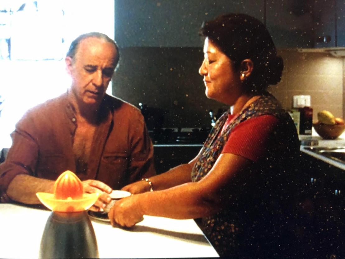 Finalmente, chiudo questa analisi del colore in uno dei miei film favoriti chiedendovi di considerare cosa succede quando Jeb ha bisogno di conforto. Quando chi parla gli dimostra affetto senza pretendere nulla in cambio. È il caso della domestica, che è sempre li ad ascoltarlo quando Jeb arriva a casa dopo una notte di festa, ed è l’unica che lo prega di non bere troppo. Nelle scene in cui Jeb e questa donna (chiaramente un’immigrante) hanno le loro affettuose conversazioni in cucina, siamo circondati dal colore arancione. Ed è cosi evidente l'intenzione di Sorrentino e dei colleghi di farci “vedere” questo arancione, che addirittura piazzano una spremiagrumi neL primo piano Dell’inquadratura. La ricerca di Bellantoni ha chiaramente stabilito che il colore arancione suscita negli spettatori un sentimento che è una via di mezzo fra la dolcezza e la tristezza. Un po’ come in tutto il film, e come certamente vuole trasmettere questa scena.